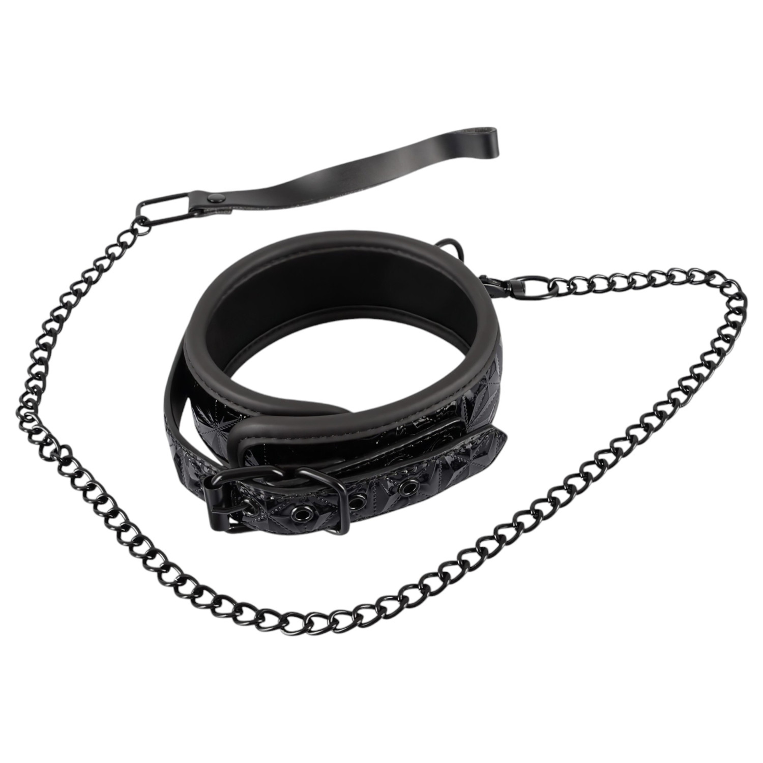 Take your dominance and submission play to a whole new level with this stylish, diamond-patterned, padded collar and its matching chain leash. The black, slightly padded collar has an embossed texture and rounded edges, ensuring both comfort and style.